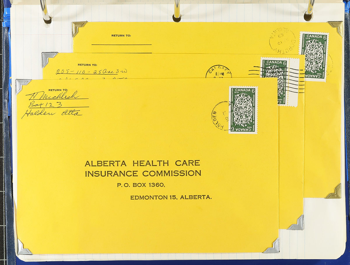 QEII balance of a massive holding (Part 1) of mostly late 1960’s, early 1970’s covers, mostly used within Alberta from a collector fascinated with the use of fluorescent/hi-brite paper. A secondary benefit is that that is a study of rates (particularly Centennial) and obsolete machine and hand cancellations from small Prairie towns. This large tub includes mounted studies of Centennial and contemporary commemoratives (e.g. ILO, Osler), but there is an envelope box and several bundles of roughly separated but not studied covers (often slightly oversized). Expect to put your UV lamp through a workout. Estimate =
