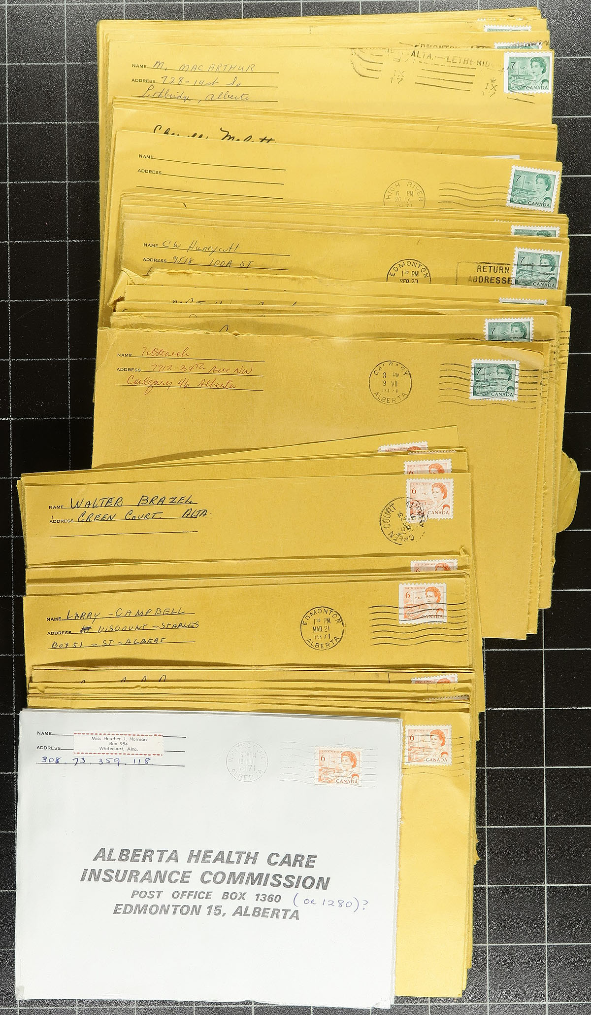QEII balance of a massive holding (Part 2) of mostly late 1960’s to early 1970’s covers, mostly used within Alberta from a collector fascinated with the use of fluorescent/hi-brite paper. A secondary benefit is that that is a study of rates (particularly Centennial) and obsolete machine and hand cancellations from small Prairie towns. This medium sized U-Haul box is filled with bundles of roughly separated but not studied covers (often slightly oversized). Expect to put your UV lamp through a workout. Estimate =