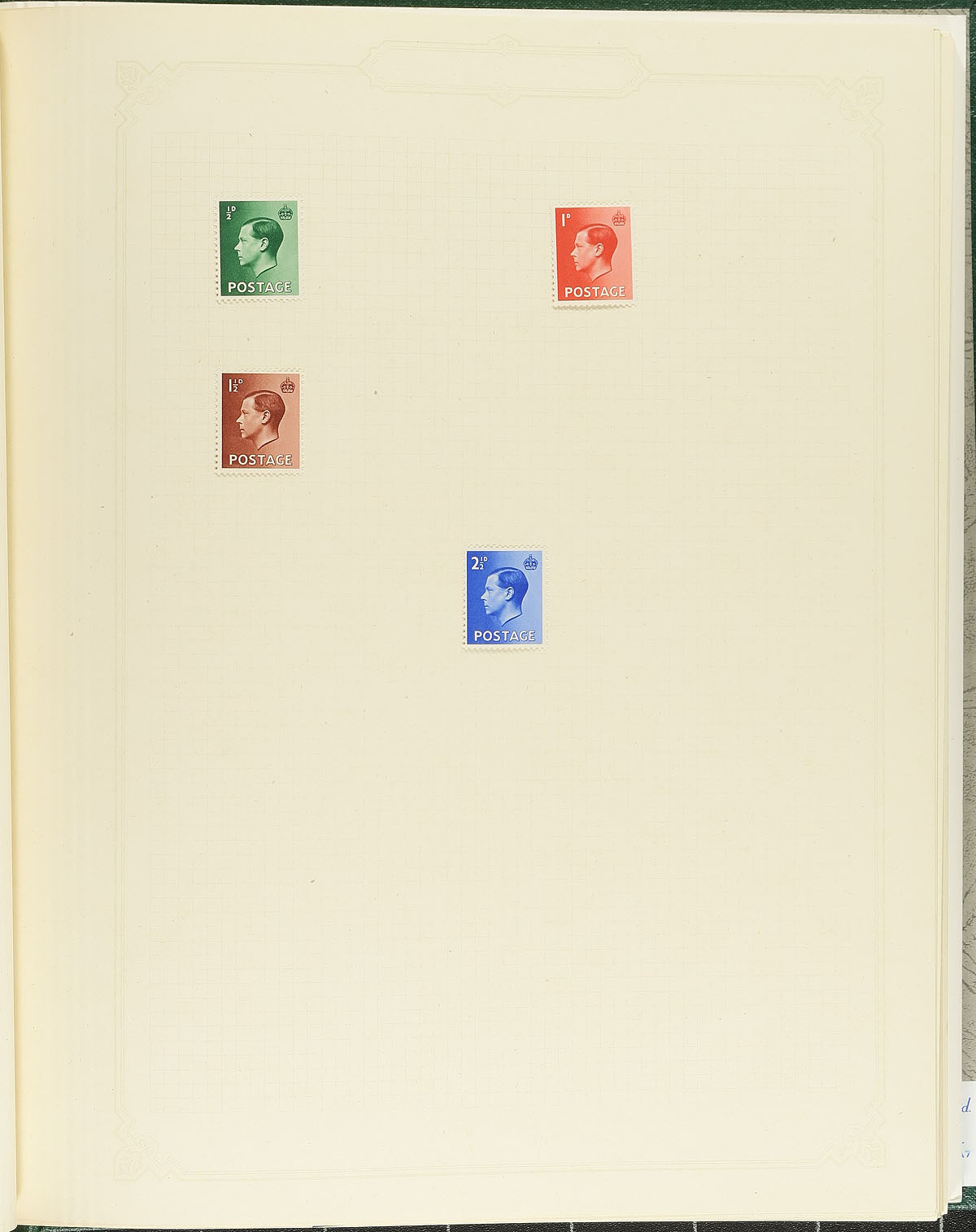 Mint and used collection on quadrilled pages in a near-new green "Simplex" springback binder with stamps up to the end of the King George VI era. There is a homemade tribute to the Penny Black on its Centenary, with a nice zero-margin copy of #1 with a red Maltese cancel. The first section of the album is the mint material, a bit sparse, but with 10 values from the Queen Victoria "Jubilee" issue up to the 1/-, looking fresh. The larger section is the used. QV includes some "Penny Reds", definitives to 5/- (a few are damaged or could use a soaking/pressing). For King Edward VII, it looks like an attempt was made at a shade study (with individual stamps to 10/-). King George V and VI includes more shades, several "Seahorses" to 10/-. The potential bonus to this lot is that the collector tucked a number of stamps into the folds of the album, which includes some better, but is generally unchecked by us. A few hundred stamps here, lots of catalogue value, with some potential for the specialist. Estimate =