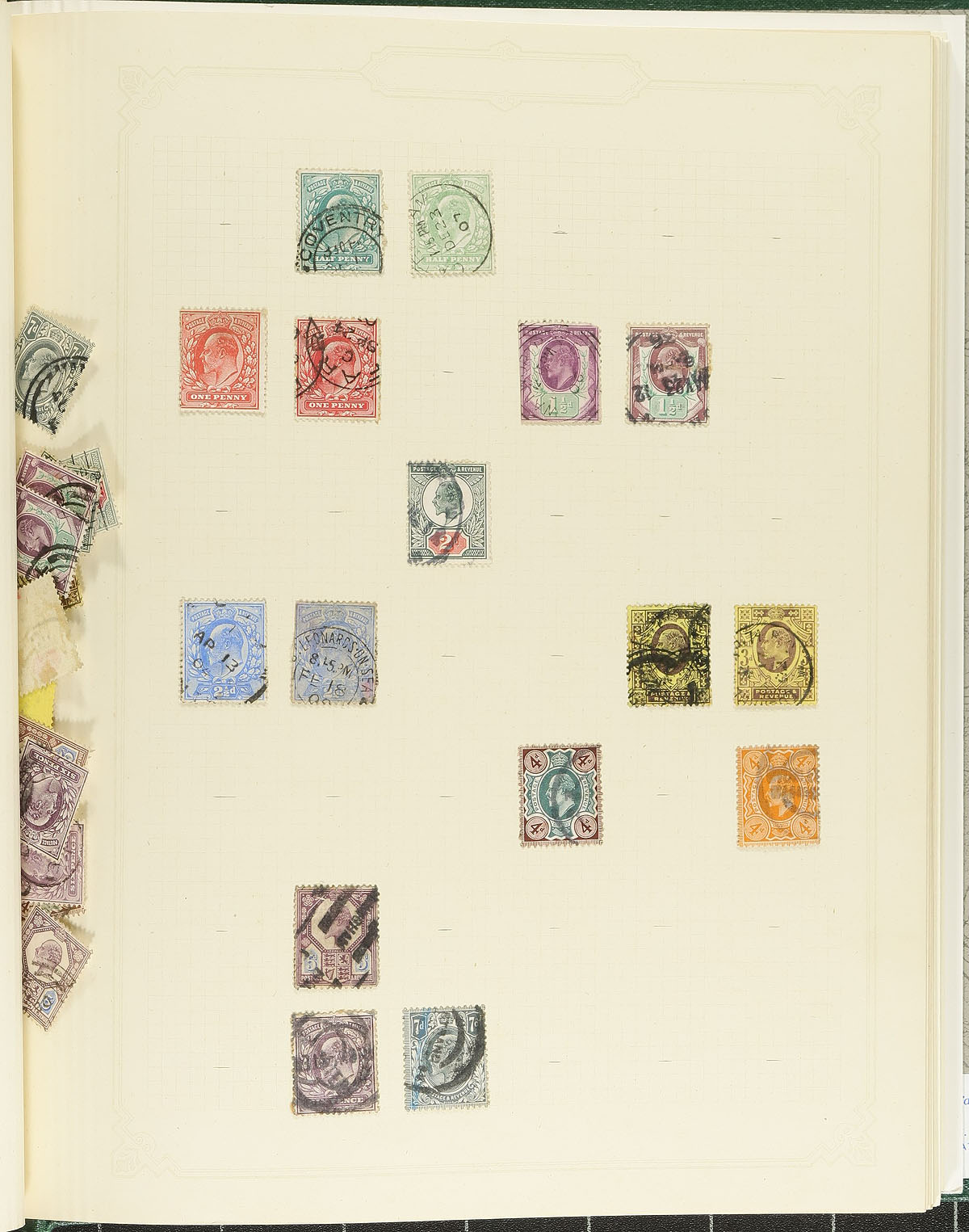Mint and used collection on quadrilled pages in a near-new green "Simplex" springback binder with stamps up to the end of the King George VI era. There is a homemade tribute to the Penny Black on its Centenary, with a nice zero-margin copy of #1 with a red Maltese cancel. The first section of the album is the mint material, a bit sparse, but with 10 values from the Queen Victoria "Jubilee" issue up to the 1/-, looking fresh. The larger section is the used. QV includes some "Penny Reds", definitives to 5/- (a few are damaged or could use a soaking/pressing). For King Edward VII, it looks like an attempt was made at a shade study (with individual stamps to 10/-). King George V and VI includes more shades, several "Seahorses" to 10/-. The potential bonus to this lot is that the collector tucked a number of stamps into the folds of the album, which includes some better, but is generally unchecked by us. A few hundred stamps here, lots of catalogue value, with some potential for the specialist. Estimate =