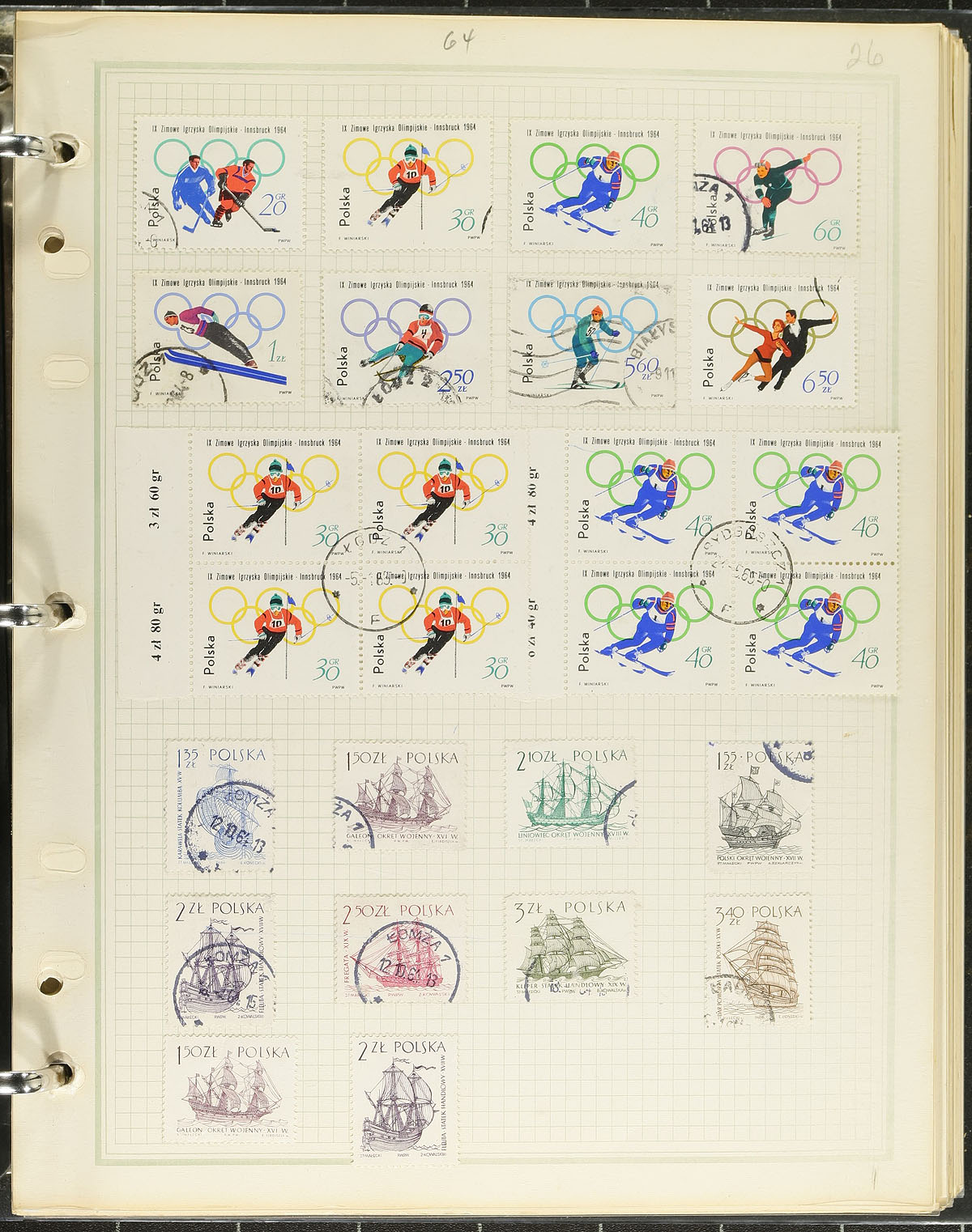 Comprehensive mounted collection in two binders with over 60 years of Polish philately. Mostly chronologically mounted with German occupation issues from WWI, a good range of inter-war issues, including a few souvenir sheets (cat up to $15.00 each). WWII includes "General Government" issues followed by a very complete offering into the early 1980’s, with lots of topical and souvenir sheets and plenty of material from the "back of the book". More used than mint. The previous owner counted about 3000 different stamps. The Minkus binder is well worn, but has done a good protecting these stamps over the decades. Estimate =