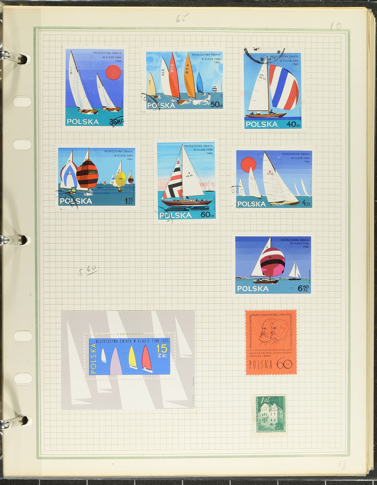 Comprehensive mounted collection in two binders with over 60 years of Polish philately. Mostly chronologically mounted with German occupation issues from WWI, a good range of inter-war issues, including a few souvenir sheets (cat up to $15.00 each). WWII includes "General Government" issues followed by a very complete offering into the early 1980’s, with lots of topical and souvenir sheets and plenty of material from the "back of the book". More used than mint. The previous owner counted about 3000 different stamps. The Minkus binder is well worn, but has done a good protecting these stamps over the decades. Estimate =
