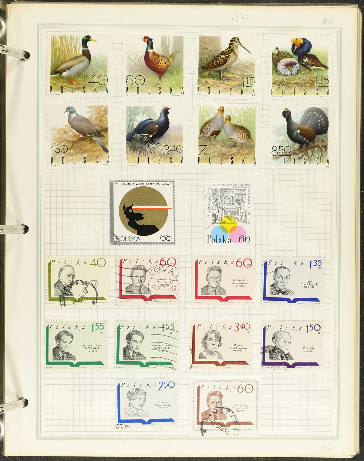 Comprehensive mounted collection in two binders with over 60 years of Polish philately. Mostly chronologically mounted with German occupation issues from WWI, a good range of inter-war issues, including a few souvenir sheets (cat up to $15.00 each). WWII includes "General Government" issues followed by a very complete offering into the early 1980’s, with lots of topical and souvenir sheets and plenty of material from the "back of the book". More used than mint. The previous owner counted about 3000 different stamps. The Minkus binder is well worn, but has done a good protecting these stamps over the decades. Estimate =