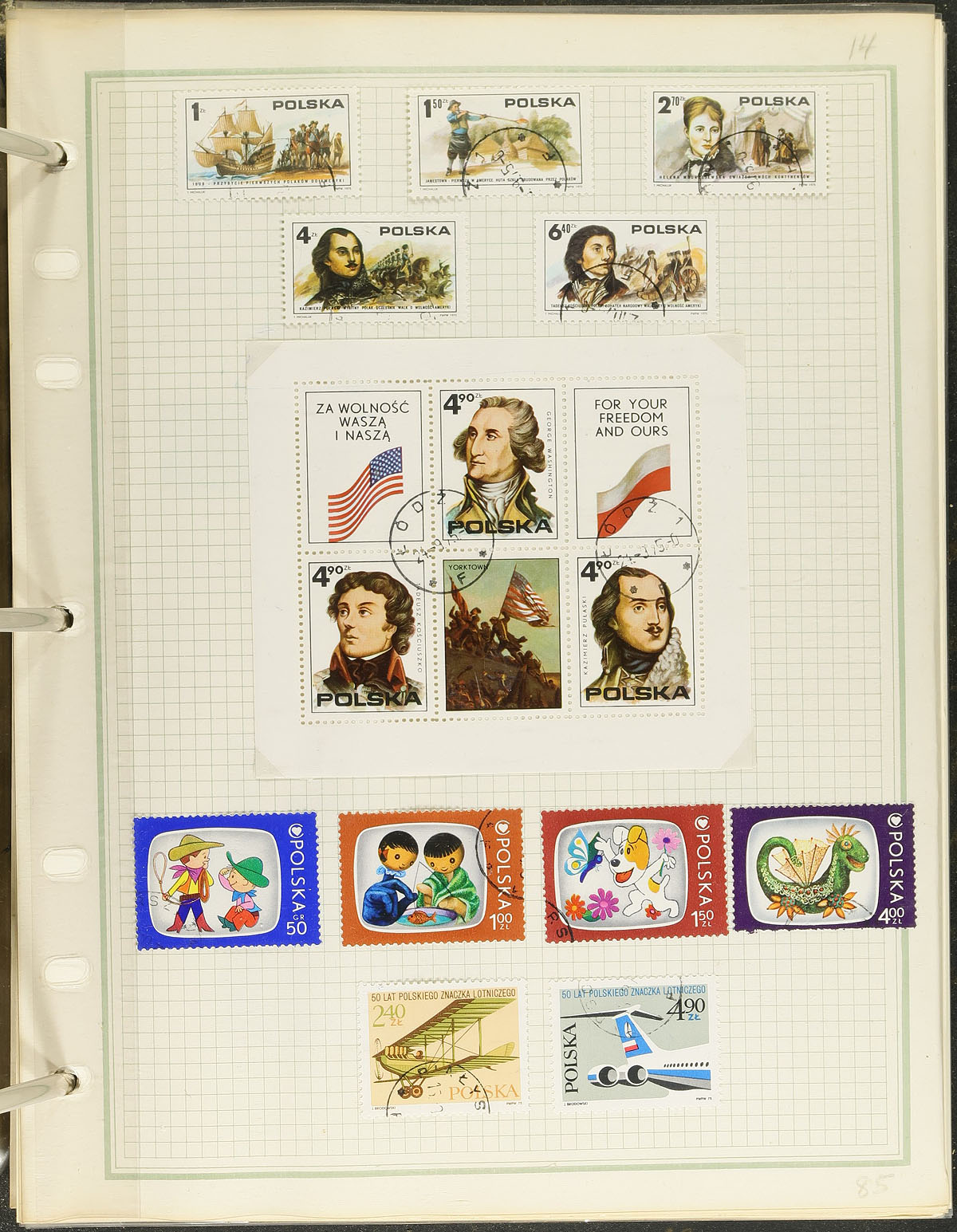 Comprehensive mounted collection in two binders with over 60 years of Polish philately. Mostly chronologically mounted with German occupation issues from WWI, a good range of inter-war issues, including a few souvenir sheets (cat up to $15.00 each). WWII includes "General Government" issues followed by a very complete offering into the early 1980’s, with lots of topical and souvenir sheets and plenty of material from the "back of the book". More used than mint. The previous owner counted about 3000 different stamps. The Minkus binder is well worn, but has done a good protecting these stamps over the decades. Estimate =