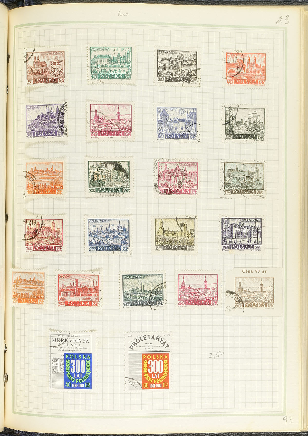 Comprehensive mounted collection in two binders with over 60 years of Polish philately. Mostly chronologically mounted with German occupation issues from WWI, a good range of inter-war issues, including a few souvenir sheets (cat up to $15.00 each). WWII includes "General Government" issues followed by a very complete offering into the early 1980’s, with lots of topical and souvenir sheets and plenty of material from the "back of the book". More used than mint. The previous owner counted about 3000 different stamps. The Minkus binder is well worn, but has done a good protecting these stamps over the decades. Estimate =