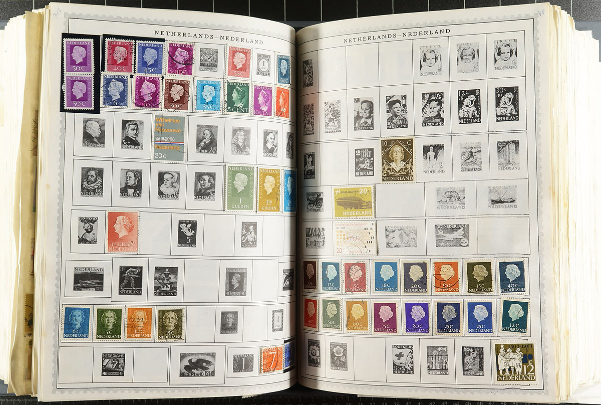 Balance of a consignment with four albums, two stockbooks and a few loose pages. The albums include a Harris Statesman Deluxe and an "Olympian" album, each running from "A" to "Z", absolutely packed with stamps from everywhere, including a nice section of China in one. The two red springback albums includes a "Simplex" with a flight topical collection with some birds and lots of airplanes and dirigibles and an older album with black pages and a topical rich assortment of worldwide. There is an Alligator brand stockbook in light green and a lightly used red Uni-Safe stockbook. Thousands upon thousands of stamps here. Estimate =