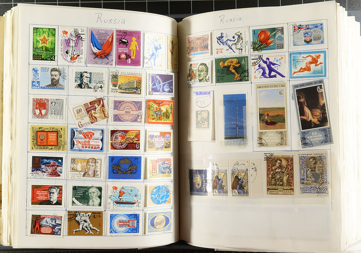 Balance of a consignment with four albums, two stockbooks and a few loose pages. The albums include a Harris Statesman Deluxe and an "Olympian" album, each running from "A" to "Z", absolutely packed with stamps from everywhere, including a nice section of China in one. The two red springback albums includes a "Simplex" with a flight topical collection with some birds and lots of airplanes and dirigibles and an older album with black pages and a topical rich assortment of worldwide. There is an Alligator brand stockbook in light green and a lightly used red Uni-Safe stockbook. Thousands upon thousands of stamps here. Estimate =