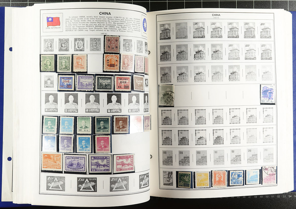 Balance of a consignment with four albums, two stockbooks and a few loose pages. The albums include a Harris Statesman Deluxe and an "Olympian" album, each running from "A" to "Z", absolutely packed with stamps from everywhere, including a nice section of China in one. The two red springback albums includes a "Simplex" with a flight topical collection with some birds and lots of airplanes and dirigibles and an older album with black pages and a topical rich assortment of worldwide. There is an Alligator brand stockbook in light green and a lightly used red Uni-Safe stockbook. Thousands upon thousands of stamps here. Estimate =