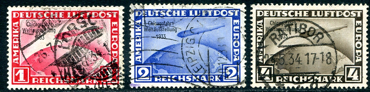 Used trio of German airmails overprinted for the Graf Zeppelin flight to the 1933 World’s Fair "Century of Progress" in Chicago. Of note, the 1m has an owner’s mark on the back and the 2 mark is cancelled in Leipzig two weeks after the stamps were released. 2024 Scott US$755.00 =