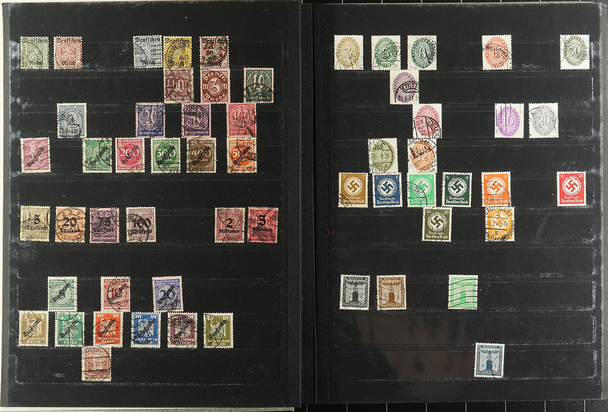 The good, bad and ugly of German philately in a 32-page Elephant stockbook with black pages and acetate strips and interleaving (stained cover). There are overprints, officials, occupation, Upper Silesia, Plebiscite, inflation period, several 19th century "States", DDR, General Government, Danzig and more! This is the kind of lot that will push you to know your catalogue, history and geography better, plus sharpen that critical eye that is looking for forgeries and reprints. Offered as received. Estimate =