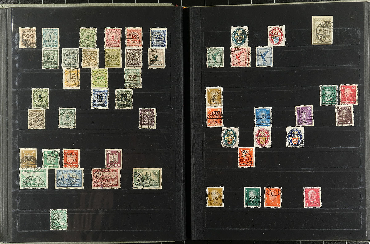 The good, bad and ugly of German philately in a 32-page Elephant stockbook with black pages and acetate strips and interleaving (stained cover). There are overprints, officials, occupation, Upper Silesia, Plebiscite, inflation period, several 19th century "States", DDR, General Government, Danzig and more! This is the kind of lot that will push you to know your catalogue, history and geography better, plus sharpen that critical eye that is looking for forgeries and reprints. Offered as received. Estimate =