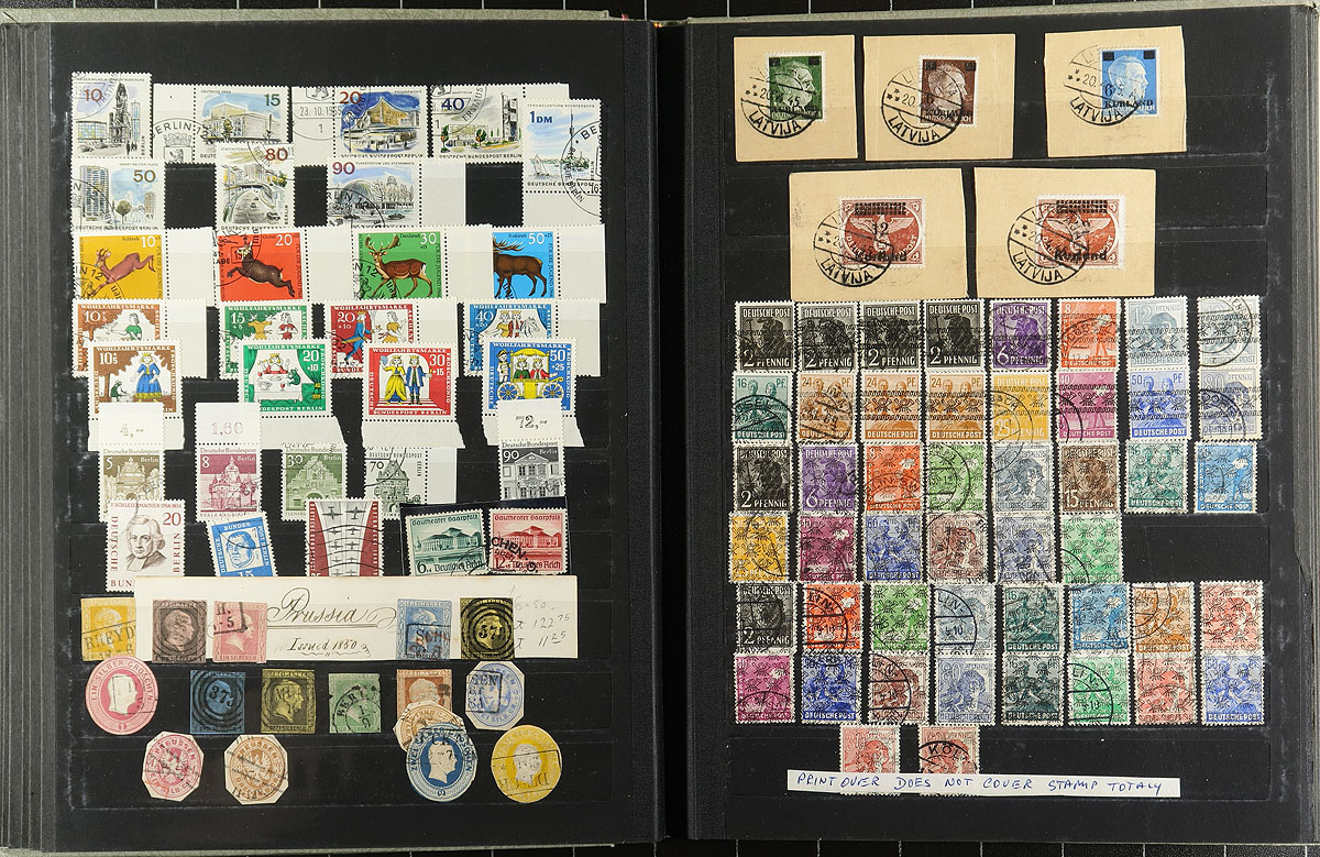The good, bad and ugly of German philately in a 32-page Elephant stockbook with black pages and acetate strips and interleaving (stained cover). There are overprints, officials, occupation, Upper Silesia, Plebiscite, inflation period, several 19th century "States", DDR, General Government, Danzig and more! This is the kind of lot that will push you to know your catalogue, history and geography better, plus sharpen that critical eye that is looking for forgeries and reprints. Offered as received. Estimate =