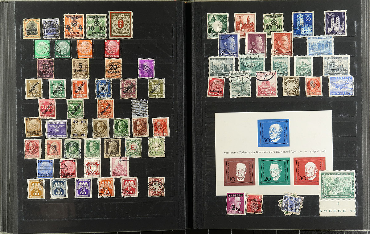 The good, bad and ugly of German philately in a 32-page Elephant stockbook with black pages and acetate strips and interleaving (stained cover). There are overprints, officials, occupation, Upper Silesia, Plebiscite, inflation period, several 19th century "States", DDR, General Government, Danzig and more! This is the kind of lot that will push you to know your catalogue, history and geography better, plus sharpen that critical eye that is looking for forgeries and reprints. Offered as received. Estimate =