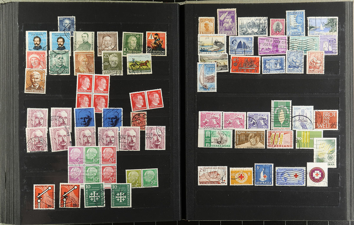 The good, bad and ugly of German philately in a 32-page Elephant stockbook with black pages and acetate strips and interleaving (stained cover). There are overprints, officials, occupation, Upper Silesia, Plebiscite, inflation period, several 19th century "States", DDR, General Government, Danzig and more! This is the kind of lot that will push you to know your catalogue, history and geography better, plus sharpen that critical eye that is looking for forgeries and reprints. Offered as received. Estimate =