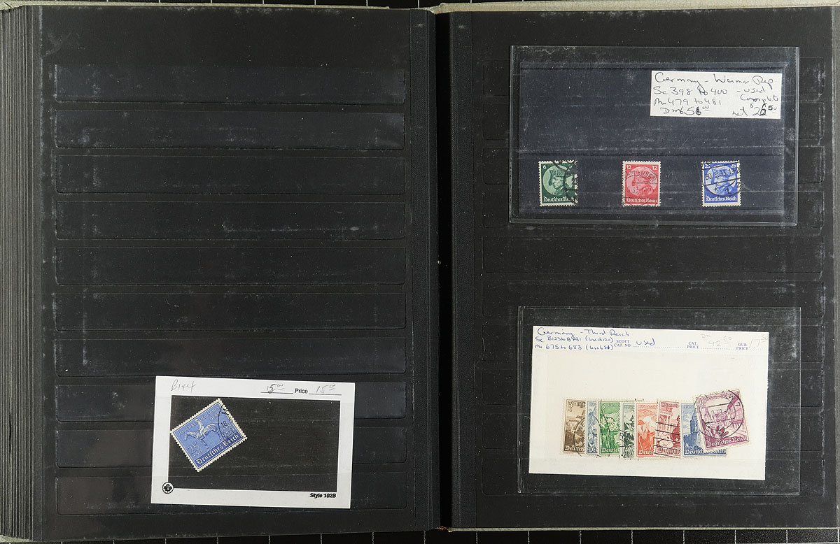 The good, bad and ugly of German philately in a 32-page Elephant stockbook with black pages and acetate strips and interleaving (stained cover). There are overprints, officials, occupation, Upper Silesia, Plebiscite, inflation period, several 19th century "States", DDR, General Government, Danzig and more! This is the kind of lot that will push you to know your catalogue, history and geography better, plus sharpen that critical eye that is looking for forgeries and reprints. Offered as received. Estimate =