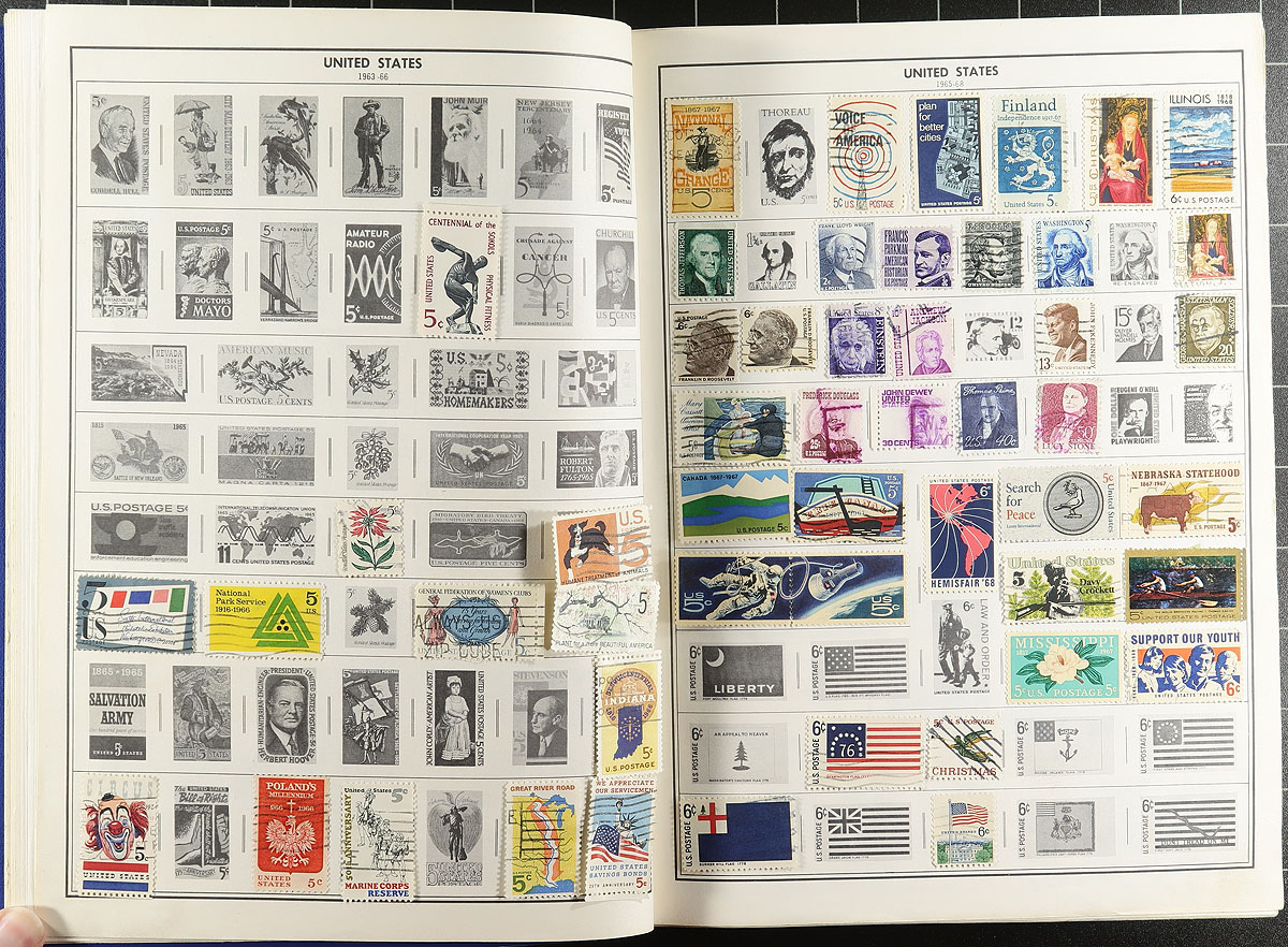 Bankers box containing a mixed bag of albums and a couple of "pocket" stockbooks. Most are old-time collections with not much past 1980. Includes a couple of three-ring binders, one is Europe heavy, the other is "A" to "G" countries. Albums include a Canada album with pages to 1975, Ambassador and Statesman albums with worldwide collections. There are some loose album and stockbook pages and a couple baby-blue coloured Filex stockbooks. Thousands of stamps here, more used than mint and offered as received. Estimate =