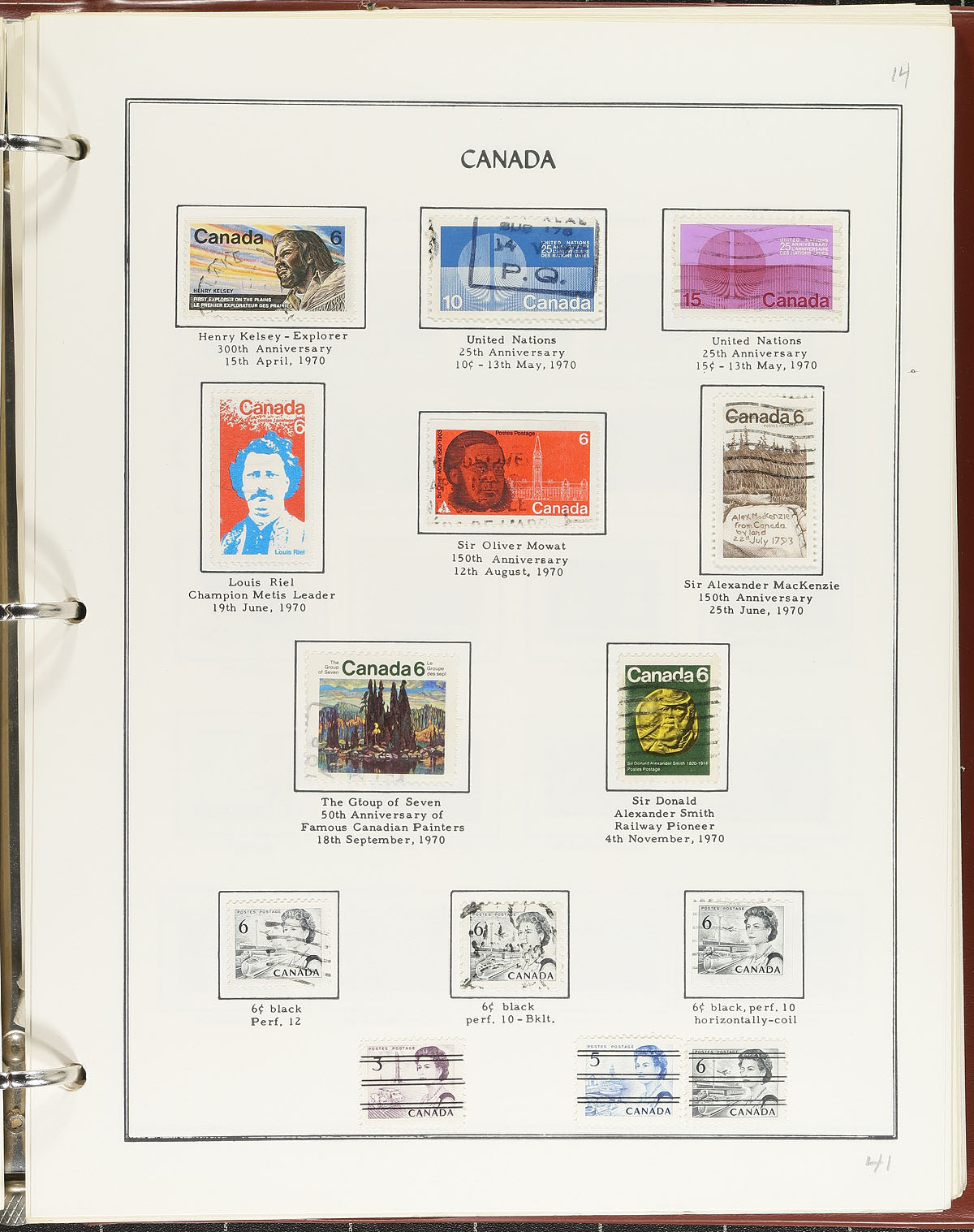 Bankers box containing a mixed bag of albums and a couple of "pocket" stockbooks. Most are old-time collections with not much past 1980. Includes a couple of three-ring binders, one is Europe heavy, the other is "A" to "G" countries. Albums include a Canada album with pages to 1975, Ambassador and Statesman albums with worldwide collections. There are some loose album and stockbook pages and a couple baby-blue coloured Filex stockbooks. Thousands of stamps here, more used than mint and offered as received. Estimate =