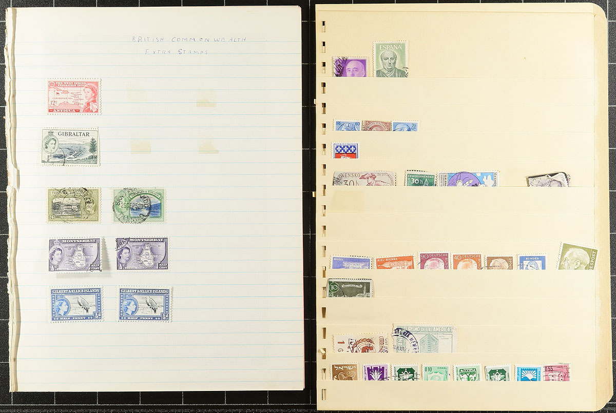 Bankers box containing a mixed bag of albums and a couple of "pocket" stockbooks. Most are old-time collections with not much past 1980. Includes a couple of three-ring binders, one is Europe heavy, the other is "A" to "G" countries. Albums include a Canada album with pages to 1975, Ambassador and Statesman albums with worldwide collections. There are some loose album and stockbook pages and a couple baby-blue coloured Filex stockbooks. Thousands of stamps here, more used than mint and offered as received. Estimate =
