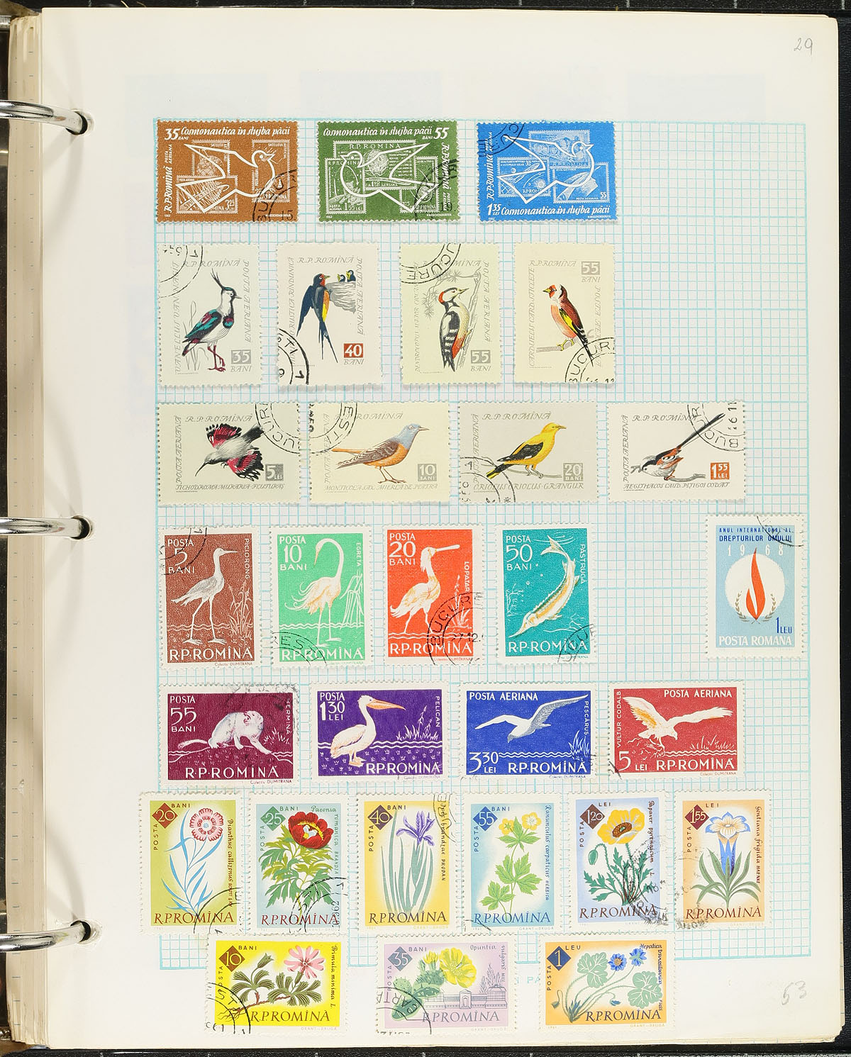 Bankers box containing a mixed bag of albums and a couple of "pocket" stockbooks. Most are old-time collections with not much past 1980. Includes a couple of three-ring binders, one is Europe heavy, the other is "A" to "G" countries. Albums include a Canada album with pages to 1975, Ambassador and Statesman albums with worldwide collections. There are some loose album and stockbook pages and a couple baby-blue coloured Filex stockbooks. Thousands of stamps here, more used than mint and offered as received. Estimate =