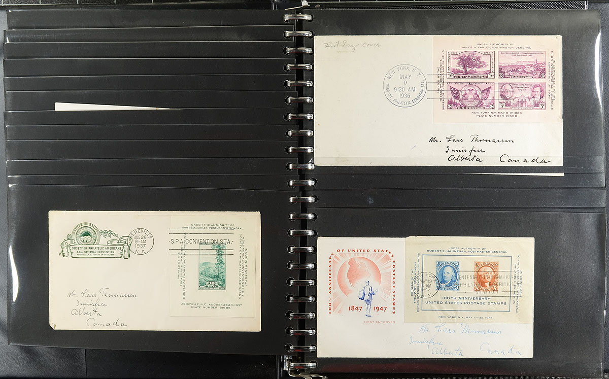 First Day Cover accumulation from the 1930’s (Byrd souvenir sheet) up to the late 1980’s (noted the $9.35 Eagle from 1983). Housed in three FDC albums, a couple of presentation folders and a couple of big handfuls of loose covers. Almost all are cacheted, includes a few commemorative or first flights. Strength is in Fleetwood, with a bit of Artmaster and National Wildlife Federation cachets, plus a number of various private cachet makers from the 1930’s to 1940’s issues. The condition is generally decent. About 500, with only light duplication. Estimate =
