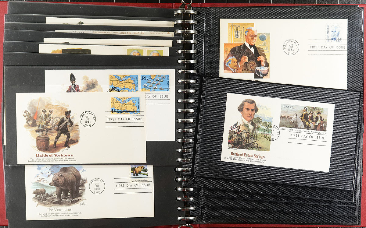 First Day Cover accumulation from the 1930’s (Byrd souvenir sheet) up to the late 1980’s (noted the $9.35 Eagle from 1983). Housed in three FDC albums, a couple of presentation folders and a couple of big handfuls of loose covers. Almost all are cacheted, includes a few commemorative or first flights. Strength is in Fleetwood, with a bit of Artmaster and National Wildlife Federation cachets, plus a number of various private cachet makers from the 1930’s to 1940’s issues. The condition is generally decent. About 500, with only light duplication. Estimate =