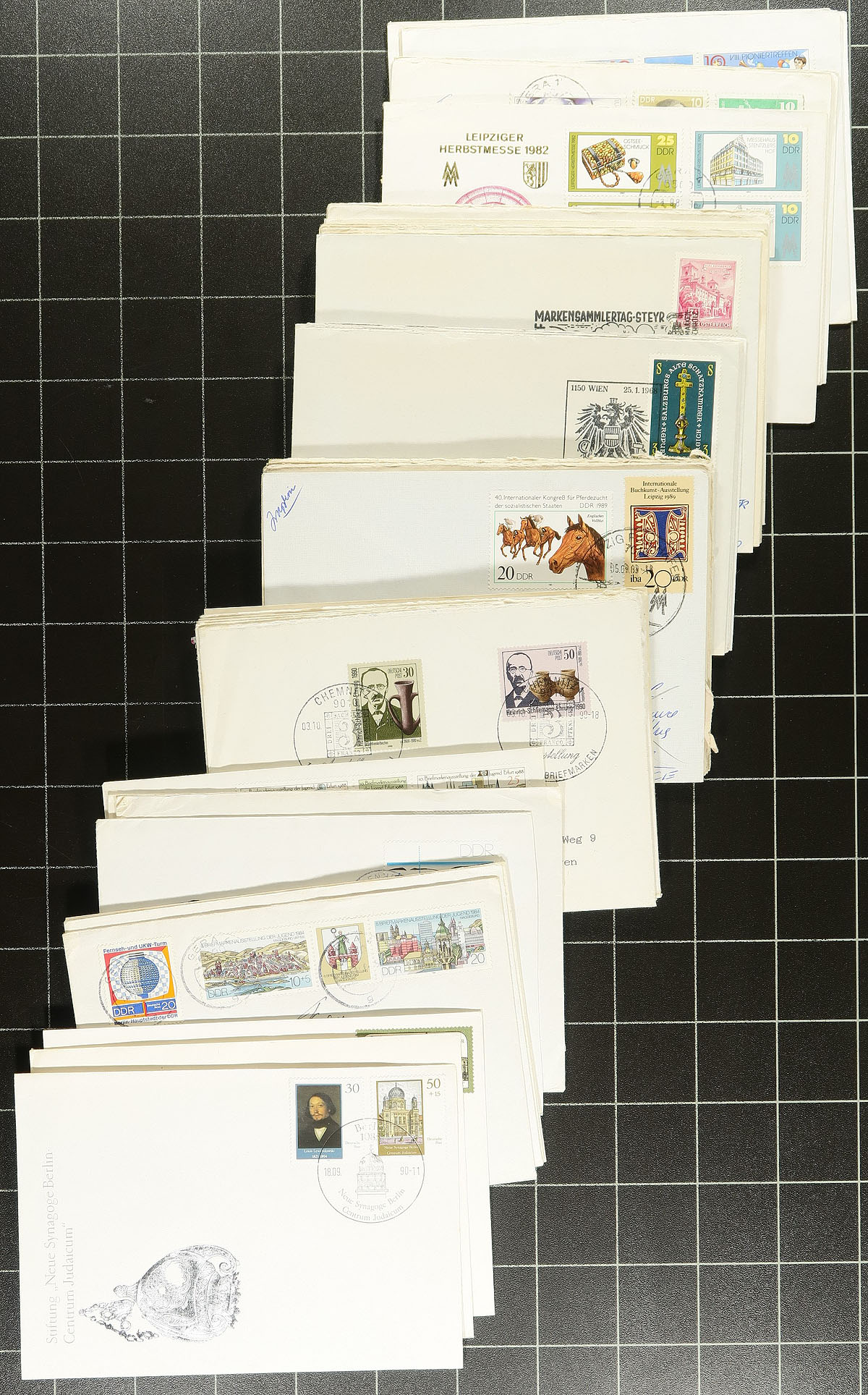Semi-sorted collection (mainly Europe) of 657 covers and postcards in a large shoe box. Lot includes 45x Norway 1950’s advertising meters, 27x Switzerland 1987 PhilSwiss cachet FDC’s (complete for 1987), 53x Germany DDR 1950’s - 1980’s FDC, 211x Austria 1950’s to 1980’s FDC (many with illustrated cancels), 175 x 1980’s / 1990’s Germany illustrated cancels, 44x Switzerland illustrated slogan cancels, 29x Liechtenstein 1980’s FDCs / covers, 73x misc worldwide cover with many illustrated postage meters. The clear emphasis of this collection is illustrated cancels and advertising meter mail. Estimate =