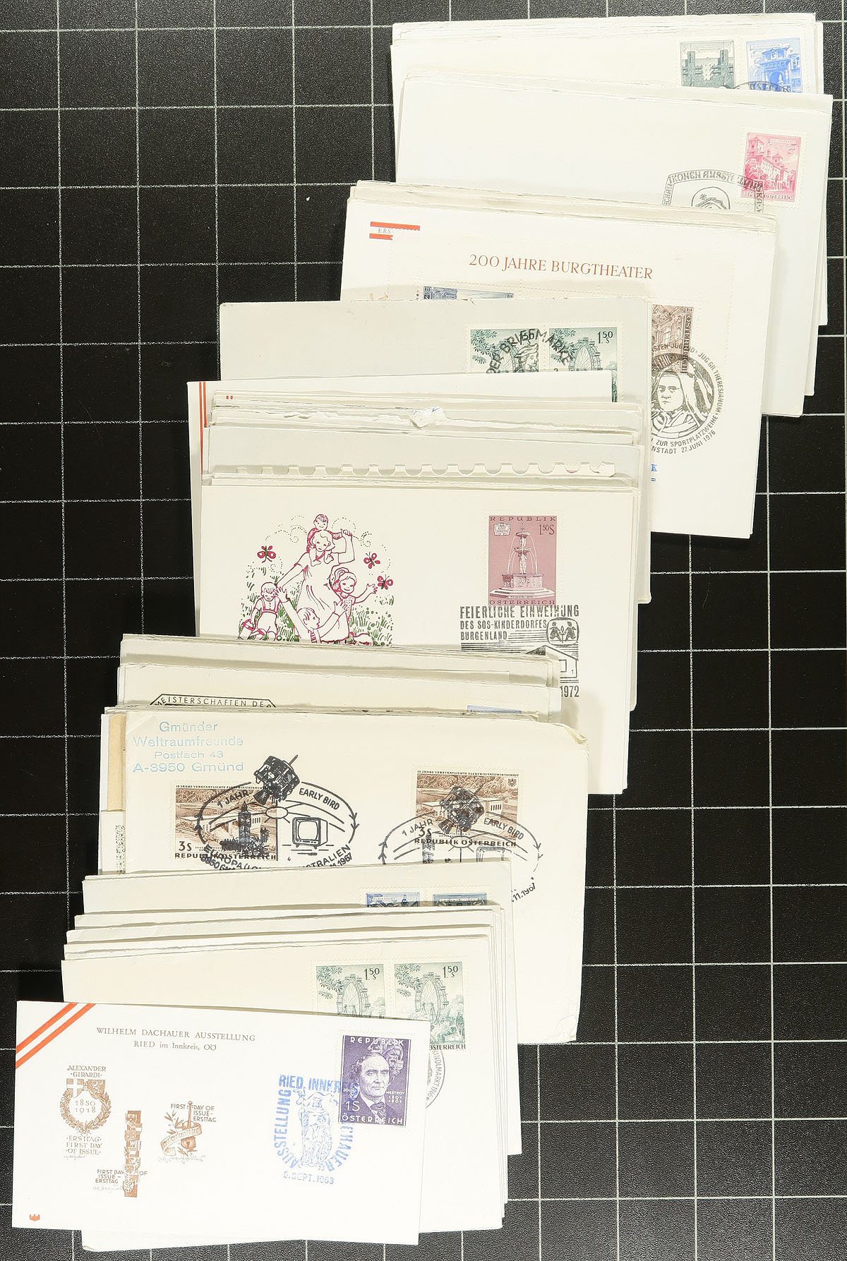 Semi-sorted collection (mainly Europe) of 657 covers and postcards in a large shoe box. Lot includes 45x Norway 1950’s advertising meters, 27x Switzerland 1987 PhilSwiss cachet FDC’s (complete for 1987), 53x Germany DDR 1950’s - 1980’s FDC, 211x Austria 1950’s to 1980’s FDC (many with illustrated cancels), 175 x 1980’s / 1990’s Germany illustrated cancels, 44x Switzerland illustrated slogan cancels, 29x Liechtenstein 1980’s FDCs / covers, 73x misc worldwide cover with many illustrated postage meters. The clear emphasis of this collection is illustrated cancels and advertising meter mail. Estimate =