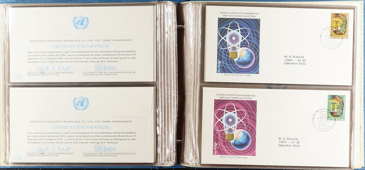 Balance of a consignment, with an album of mint stamps issued 1951-1975 (including souvenir sheet #38 and a number of presentation folders). There is an album of late-1970’s first day covers (with illustrated cachet). The best might be the complete 1980-1989 Flags issues in small albums, including mint sheetlets of 16 (face value of the stamps over the 10 years is US$135.00), and the other is single stamps on First Day Covers (same original cost plus the cost of the albums and cover servicing). Good condition overall. Substantial original cost. Estimate =