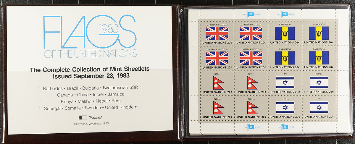 Balance of a consignment, with an album of mint stamps issued 1951-1975 (including souvenir sheet #38 and a number of presentation folders). There is an album of late-1970’s first day covers (with illustrated cachet). The best might be the complete 1980-1989 Flags issues in small albums, including mint sheetlets of 16 (face value of the stamps over the 10 years is US$135.00), and the other is single stamps on First Day Covers (same original cost plus the cost of the albums and cover servicing). Good condition overall. Substantial original cost. Estimate =