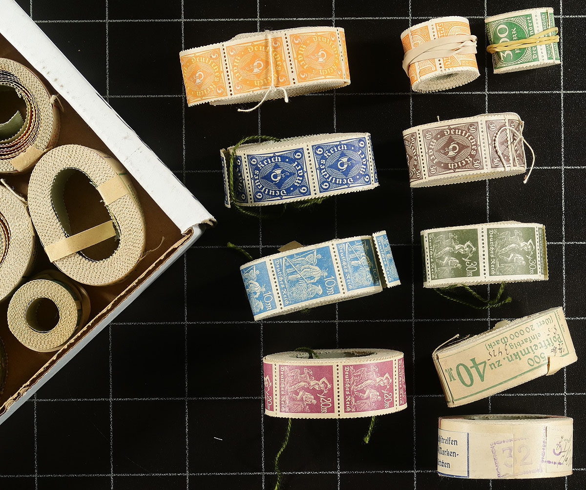 Lot B: Mint German coils, what appears to be 7 complete (or near-complete) rolls (with outside wrappers) and 18 partial rolls, each with lots of potential to produce numerous "proving" strips of 11 (to differentiate them from sheet stock). These are from the early part of the hyper-inflation era of 1922. The Michel catalogue value on these will add up quickly. Estimated value =