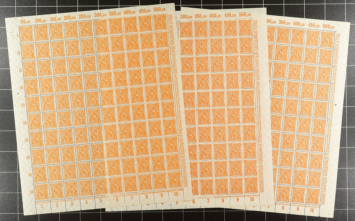 Complete sheets of 1920-1922 post-War issues leading up to the hyper-inflation period. All complete panes of 50 or 100, with 1-8 sheets per issue. A total of 54 sheets from 16 different issues. Lovely condition with a surprising amount of printing variations in the selvedge. While they are cheaper stamps, they make for very attractive, possibly even frame-able pieces. Total 2024 Scott US$1287.50 =