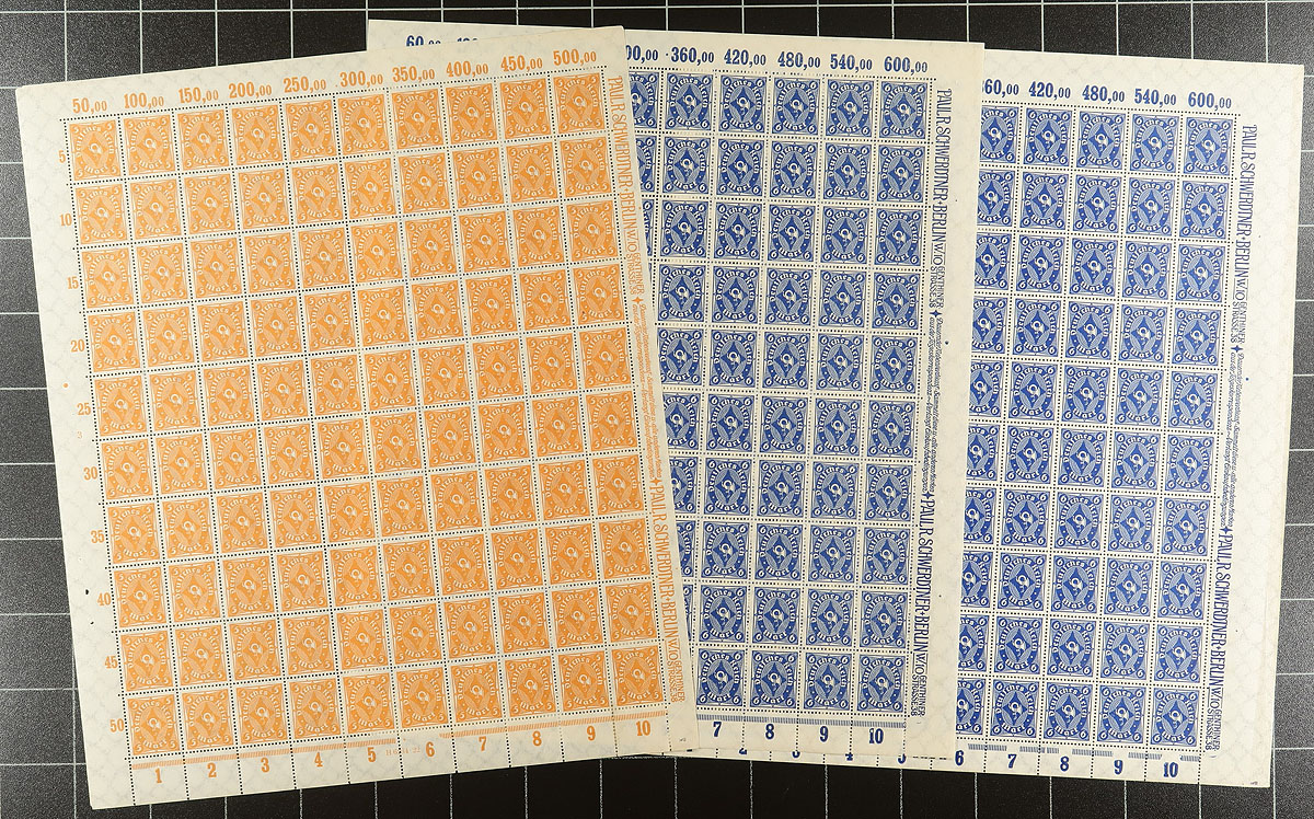 Complete sheets of 1920-1922 post-War issues leading up to the hyper-inflation period. All complete panes of 50 or 100, with 1-8 sheets per issue. A total of 54 sheets from 16 different issues. Lovely condition with a surprising amount of printing variations in the selvedge. While they are cheaper stamps, they make for very attractive, possibly even frame-able pieces. Total 2024 Scott US$1287.50 =