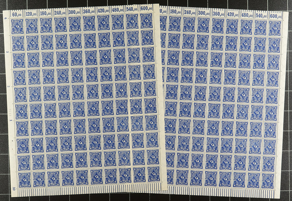 Complete sheets of 1920-1922 post-War issues leading up to the hyper-inflation period. All complete panes of 50 or 100, with 1-8 sheets per issue. A total of 54 sheets from 16 different issues. Lovely condition with a surprising amount of printing variations in the selvedge. While they are cheaper stamps, they make for very attractive, possibly even frame-able pieces. Total 2024 Scott US$1287.50 =