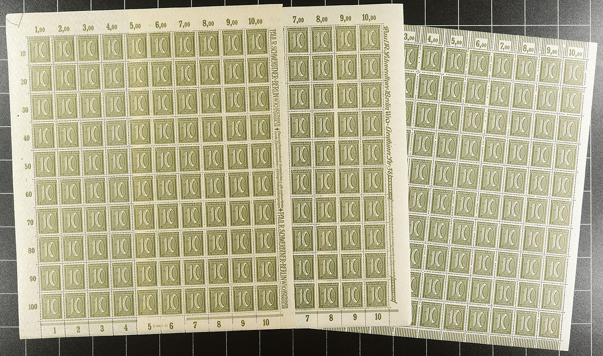 Complete sheets of 1920-1922 post-War issues leading up to the hyper-inflation period. All complete panes of 50 or 100, with 1-8 sheets per issue. A total of 54 sheets from 16 different issues. Lovely condition with a surprising amount of printing variations in the selvedge. While they are cheaper stamps, they make for very attractive, possibly even frame-able pieces. Total 2024 Scott US$1287.50 =