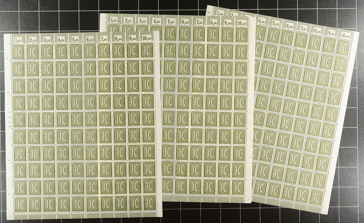 Complete sheets of 1920-1922 post-War issues leading up to the hyper-inflation period. All complete panes of 50 or 100, with 1-8 sheets per issue. A total of 54 sheets from 16 different issues. Lovely condition with a surprising amount of printing variations in the selvedge. While they are cheaper stamps, they make for very attractive, possibly even frame-able pieces. Total 2024 Scott US$1287.50 =
