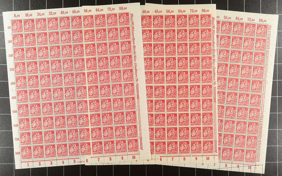 Complete sheets of 1920-1922 post-War issues leading up to the hyper-inflation period. All complete panes of 50 or 100, with 1-8 sheets per issue. A total of 54 sheets from 16 different issues. Lovely condition with a surprising amount of printing variations in the selvedge. While they are cheaper stamps, they make for very attractive, possibly even frame-able pieces. Total 2024 Scott US$1287.50 =