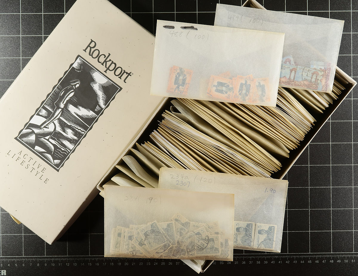 Monumental collector’s used duplicates covering 1867 to 1993 issues with a hefty amount of "back of the book", particularly airmail and officials. Each issue is sorted into its own glassine envelope and marked with the Scott catalogue number and the approximate quantity (up to 200 stamps per glassine). Lots of $1-$5 issues, with a few slightly better (#11a (10 copies), #40 (x8), #240 (100+). This collector excluded damaged stamps and loved clean, readable cancels of which there are hundreds throughout. Strong in definitive issues. Four packed shoe boxes, filling a banker’s box. Tens of thousands of stamps. Don’t wait for the next one. Estimate =
