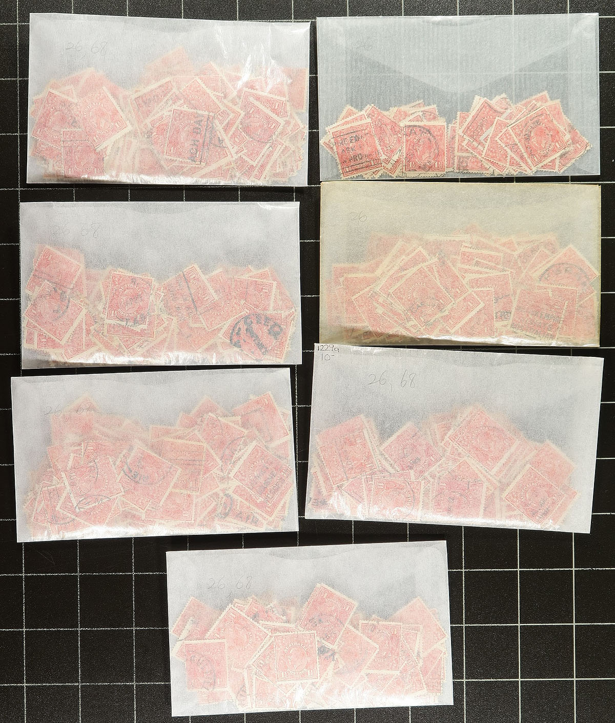 Part 1: King George V "Heads" used hoard, a wide range of issues up to the 5d in wholesale quantities of up to a couple hundred copies per stamp. All given a primary sort (some watermarks and shades yet to be identified) and put into 60+ glassine envelopes (which fills a shoebox), each with the Scott number noted. Includes a few slightly better (#29, #31, #33, #72), there is potential for hunting cancels and varieties. Several thousand stamps here. Estimate =