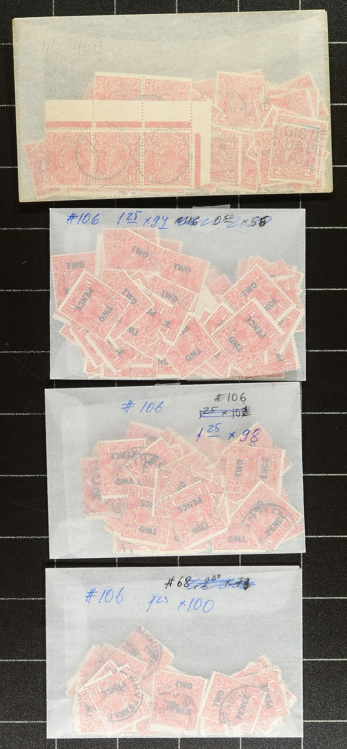 Part 1: King George V "Heads" used hoard, a wide range of issues up to the 5d in wholesale quantities of up to a couple hundred copies per stamp. All given a primary sort (some watermarks and shades yet to be identified) and put into 60+ glassine envelopes (which fills a shoebox), each with the Scott number noted. Includes a few slightly better (#29, #31, #33, #72), there is potential for hunting cancels and varieties. Several thousand stamps here. Estimate =