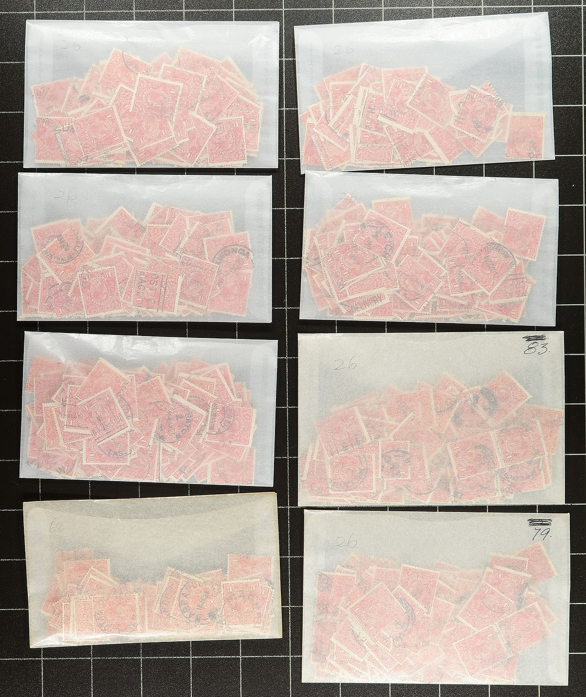 Part 2: King George V "Heads" used hoard, almost all 1d and 1-1/2d denominations and mostly redheads. Roughly sorted into glassines, baggies and #10 envelopes, which fill a shoebox. Most have been given a primary sort (many watermarks and shades yet to be identified), each with the Scott numbers noted. There is potential for hunting cancels and varieties. A few thousand stamps here. Estimate =
