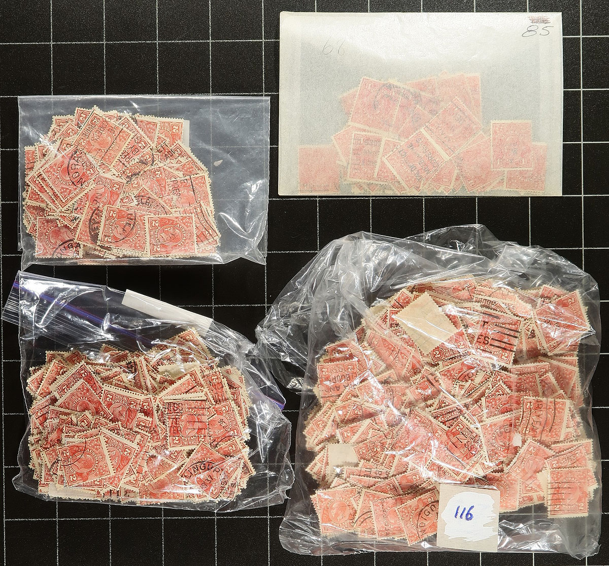 Part 2: King George V "Heads" used hoard, almost all 1d and 1-1/2d denominations and mostly redheads. Roughly sorted into glassines, baggies and #10 envelopes, which fill a shoebox. Most have been given a primary sort (many watermarks and shades yet to be identified), each with the Scott numbers noted. There is potential for hunting cancels and varieties. A few thousand stamps here. Estimate =