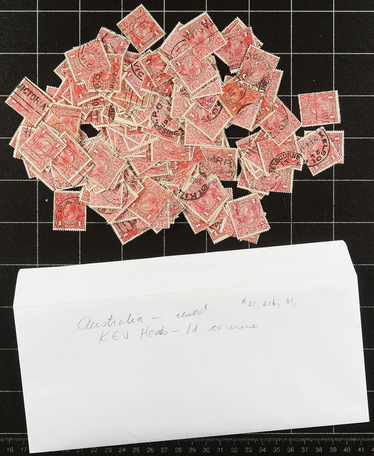 Part 2: King George V "Heads" used hoard, almost all 1d and 1-1/2d denominations and mostly redheads. Roughly sorted into glassines, baggies and #10 envelopes, which fill a shoebox.