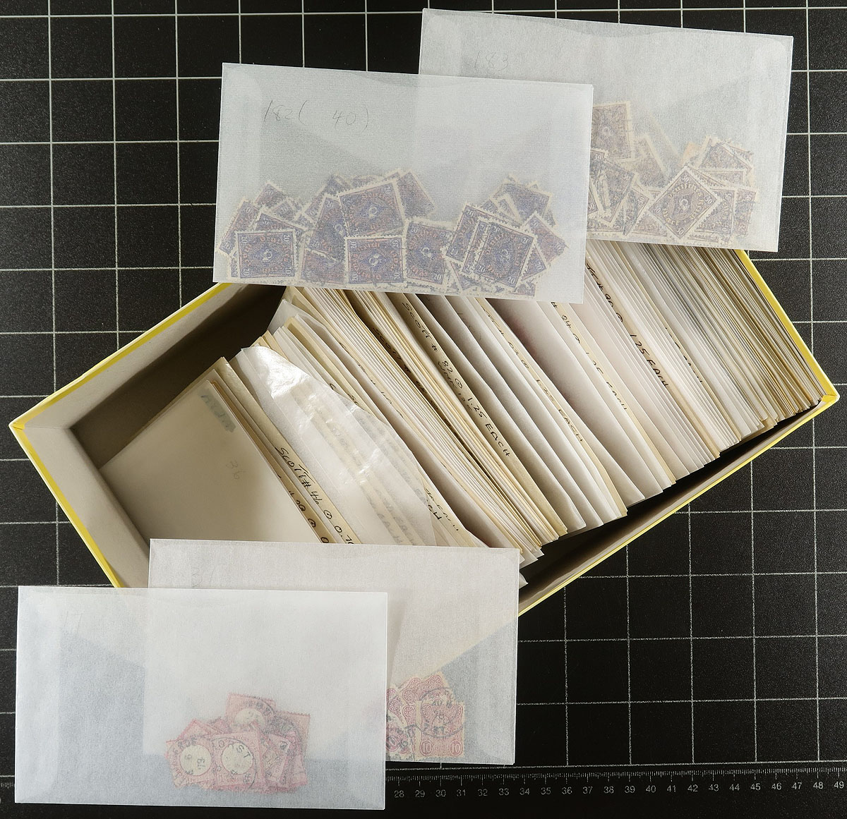 Super used holding Part A (#17/184). This section runs 1872-1922. Includes lots of Germania (with the 1m and 2m buildings) and into the early hyper-inflation period (where used is harder to find than mint). All are sorted individually into #5 sized glassine envelopes and marked with the Scott number (if there are catalogue prices, they are quite old). Most are relatively common, but there will be substantial numbers cataloguing $1.50-$5.00 each. This collector excluded damaged stamps and had a fondness for readable cancels and there are hundreds (if not more). Thousands of off-paper stamps, filling a shoebox. Estimate =