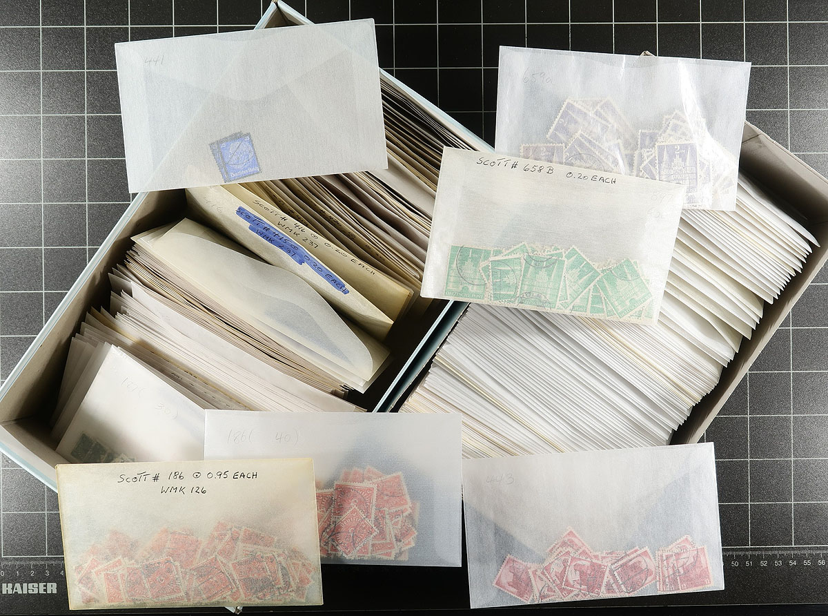 Super used holding Part B (#184/659a). This section runs 1922-1946. Includes lots of hyper-inflation period (where used is harder to find than mint), Hindenburg, a bit of Nazi-era and some post-WWII (castles). All are sorted individually into #5 sized glassine envelopes and marked with the Scott number (if there are catalogue prices, they are quite old). Most are relatively common, but there will be substantial numbers cataloguing $1.50-$5.00 each. This collector excluded damaged stamps and had a fondness for readable cancels and there are hundreds (if not more). Thousands of off-paper stamps, filling two shoeboxes. Estimate =