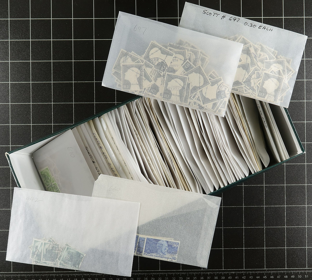 Super used holding Part C (#669/697). This section runs for a short period in the post-war period from 1948-1953, as there is better value material. We note #669, Posthorn #683, #686, #688, #691, #693, #695 - from 4 to 20 copies of each and many other commemoratives and definitives from a period where used examples are harder to find used, than mint. All are sorted individually into #5 sized glassine envelopes and marked with the Scott number (if there are catalogue prices, they are quite old). This collector excluded damaged stamps and had a fondness for readable cancels and there are hundreds (if not more). A couple of thousand off-paper stamps, filling a shoebox. Estimate =