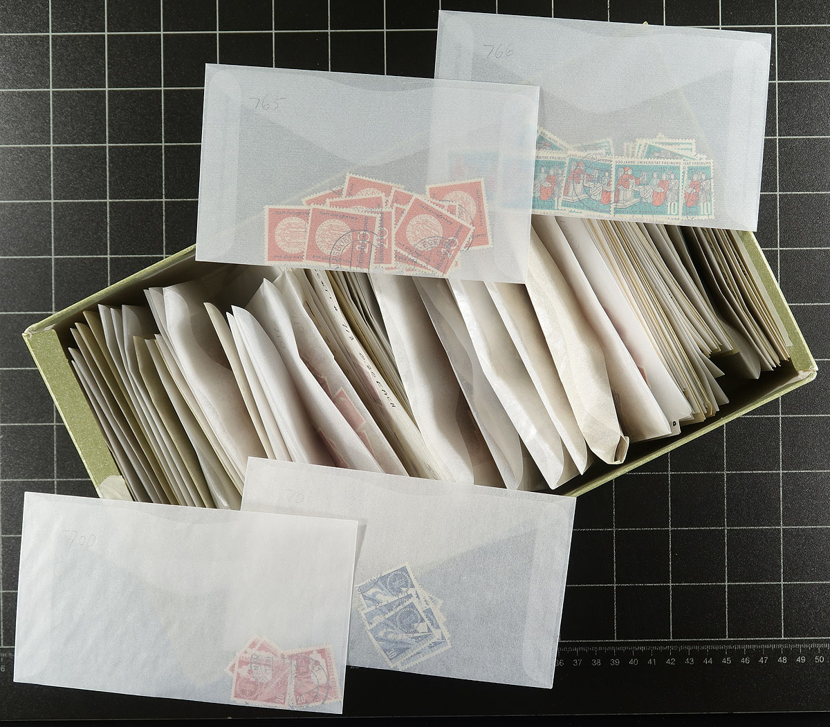 Super used holding Part D (#700/1004). This section covers 1953-1969. A period of mostly common stamps, but did notice #701, #712 (many copies), #727. All are sorted individually into #5 sized glassine envelopes and marked with the Scott number (if there are catalogue prices, they are quite old). This collector excluded damaged stamps and had a fondness for readable cancels and there are hundreds (if not more). Thousands of off-paper stamps, filling three shoeboxes. Estimate =