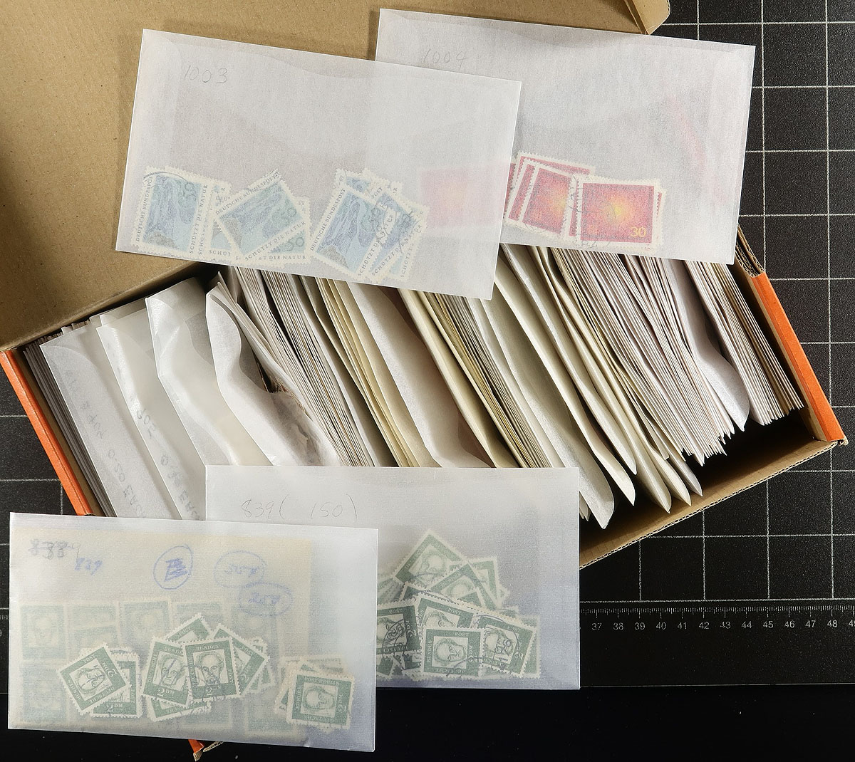 Super used holding Part D (#700/1004). This section covers 1953-1969. A period of mostly common stamps, but did notice #701, #712 (many copies), #727. All are sorted individually into #5 sized glassine envelopes and marked with the Scott number (if there are catalogue prices, they are quite old). This collector excluded damaged stamps and had a fondness for readable cancels and there are hundreds (if not more). Thousands of off-paper stamps, filling three shoeboxes. Estimate =