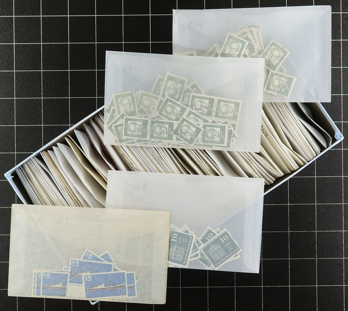 Super used holding Part D (#700/1004). This section covers 1953-1969. A period of mostly common stamps, but did notice #701, #712 (many copies), #727. All are sorted individually into #5 sized glassine envelopes and marked with the Scott number (if there are catalogue prices, they are quite old). This collector excluded damaged stamps and had a fondness for readable cancels and there are hundreds (if not more). Thousands of off-paper stamps, filling three shoeboxes. Estimate =