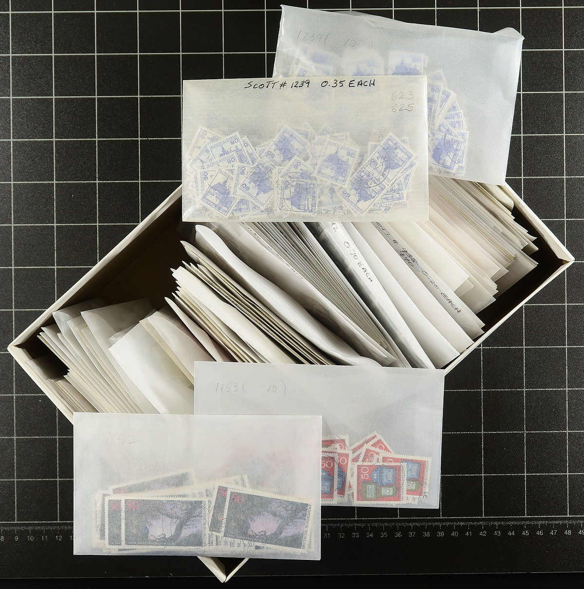 Super used holding Part E (#1005/1735). This section runs 1969-1992. Most are relatively common, but there will be substantial numbers cataloguing $1.50-$5.00 each (such as the "Famous Women" series). All are sorted individually into #5 sized glassine envelopes and marked with the Scott number. This collector excluded damaged stamps and had a fondness for readable cancels and there are hundreds (if not more). Thousands of off-paper stamps, filling FIVE shoeboxes. Estimate =