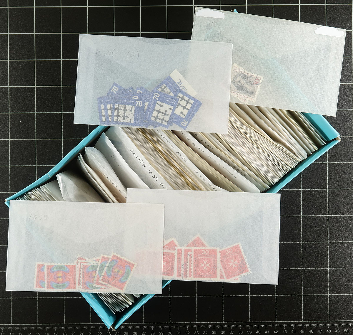 Super used holding Part E (#1005/1735). This section runs 1969-1992. Most are relatively common, but there will be substantial numbers cataloguing $1.50-$5.00 each (such as the "Famous Women" series). All are sorted individually into #5 sized glassine envelopes and marked with the Scott number. This collector excluded damaged stamps and had a fondness for readable cancels and there are hundreds (if not more). Thousands of off-paper stamps, filling FIVE shoeboxes. Estimate =